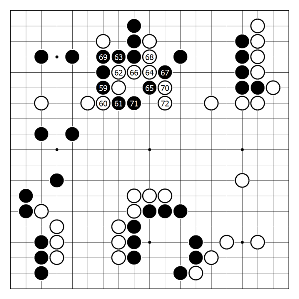 黑棋忍无可忍,实战果断选择冲断。李维清见状打出白64跳,在战火中又加了一把柴。白棋“送”了一串后,得到了白70、72两手,又一次将选择权推到了丁浩手中。