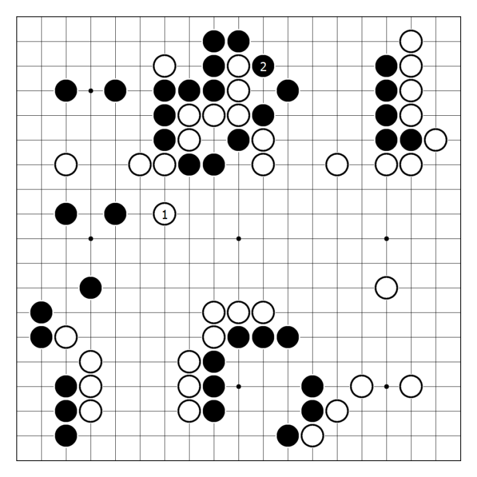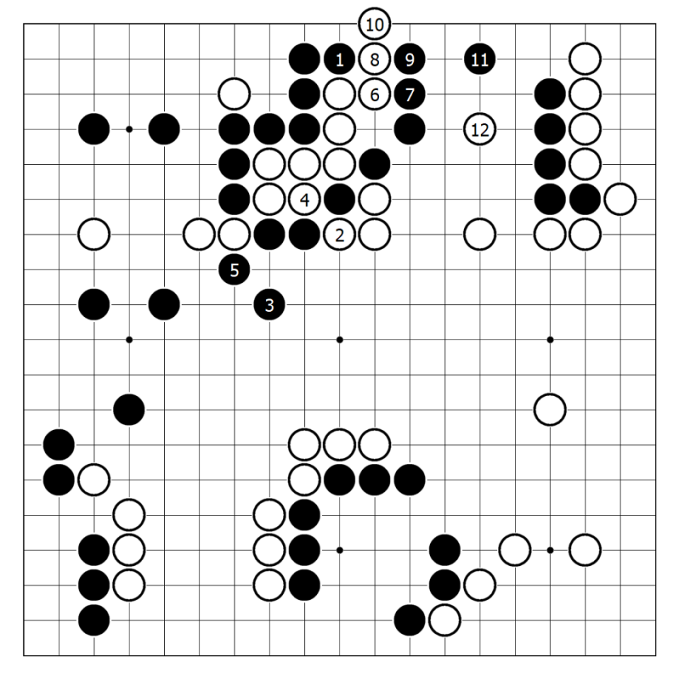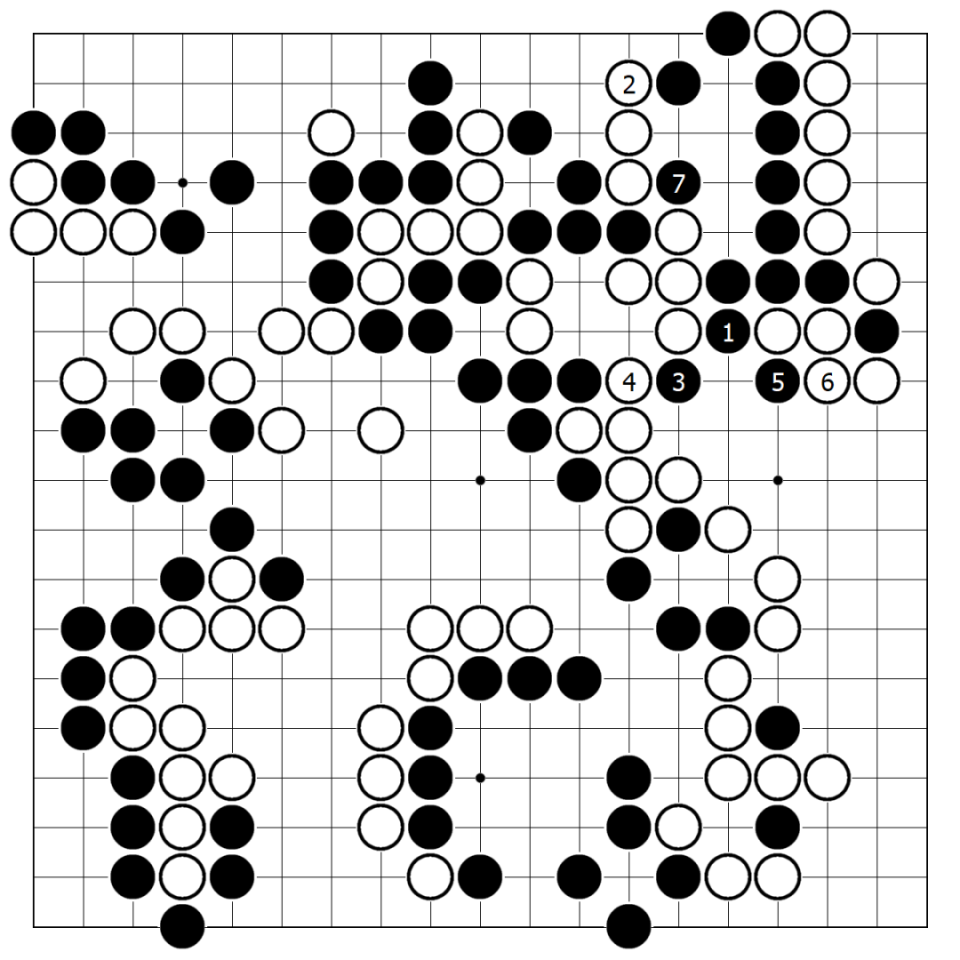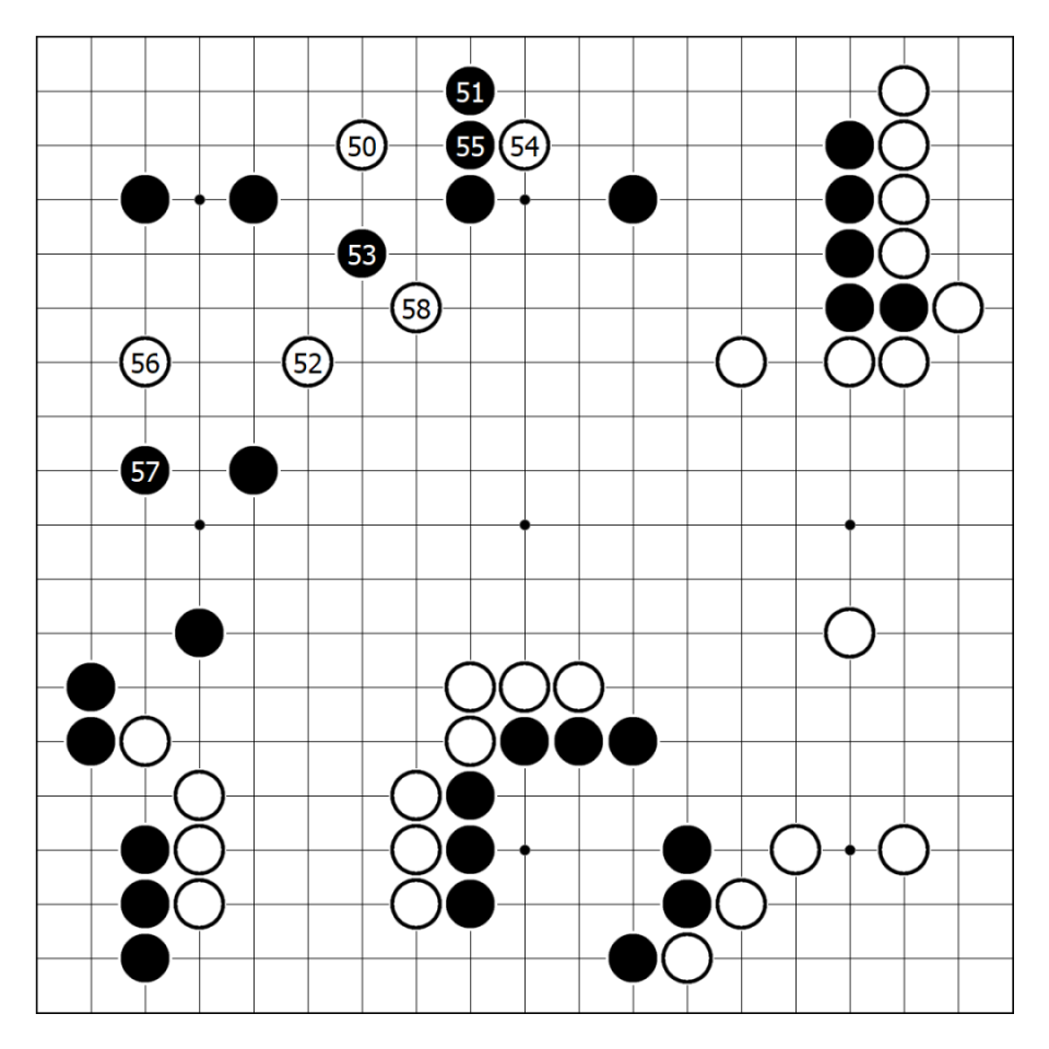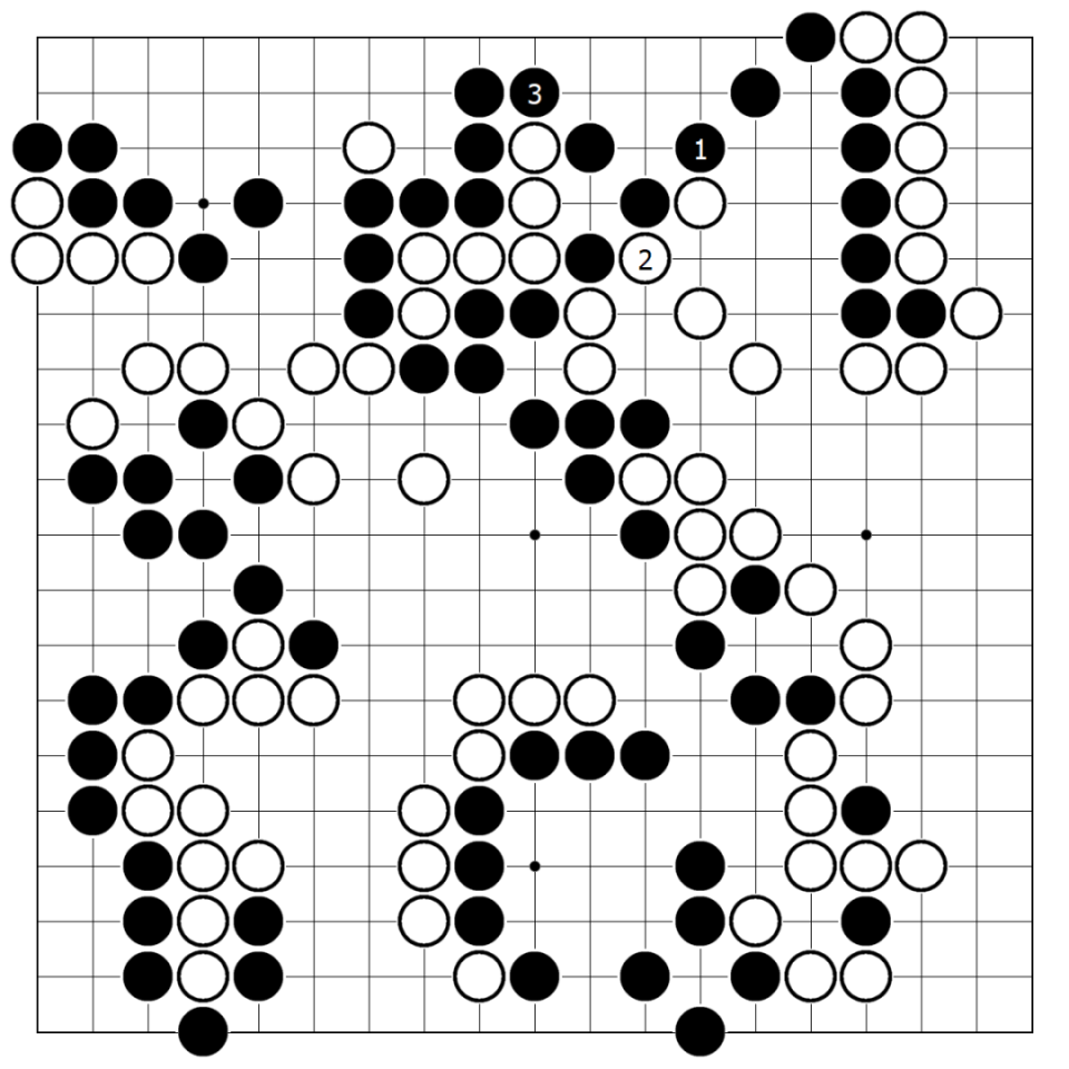 白棋如果不反击,黑棋可以一手吃净。本图作为展示,用以和实战后续对比。