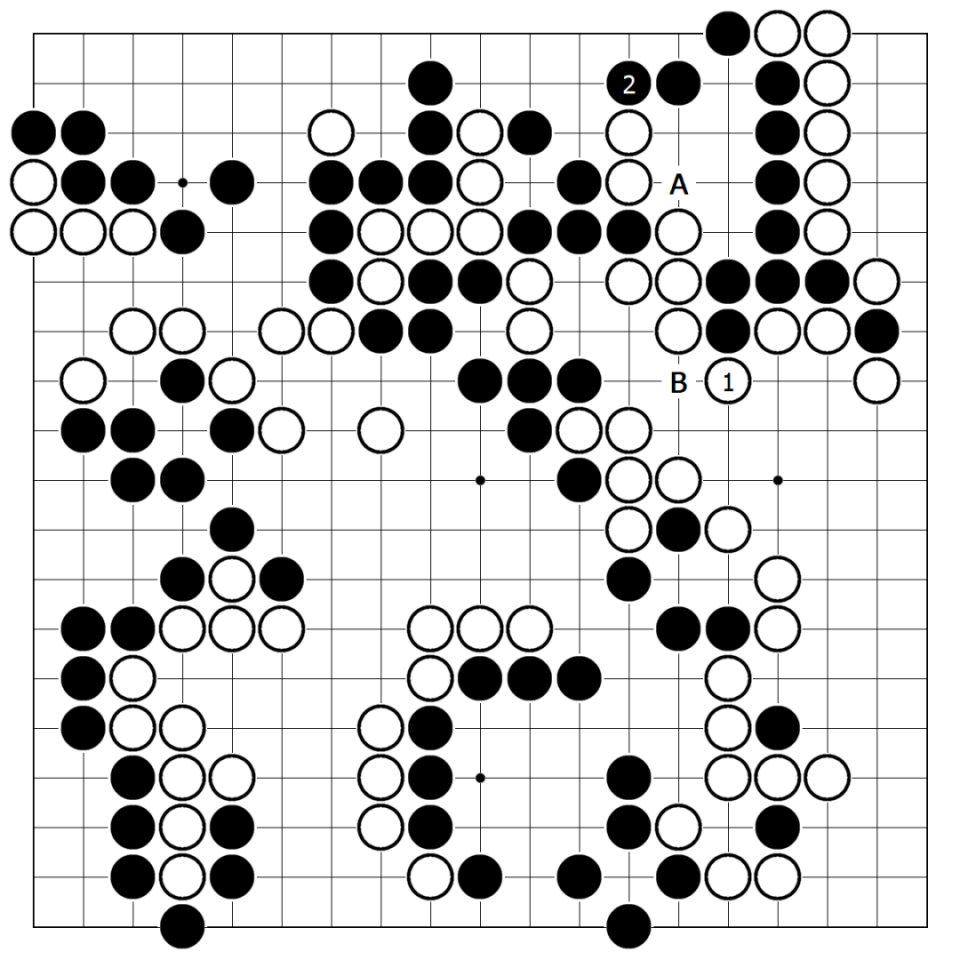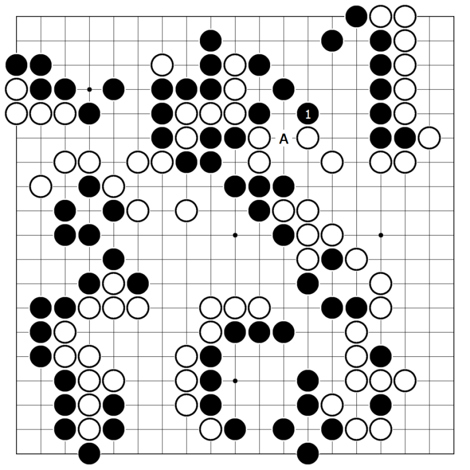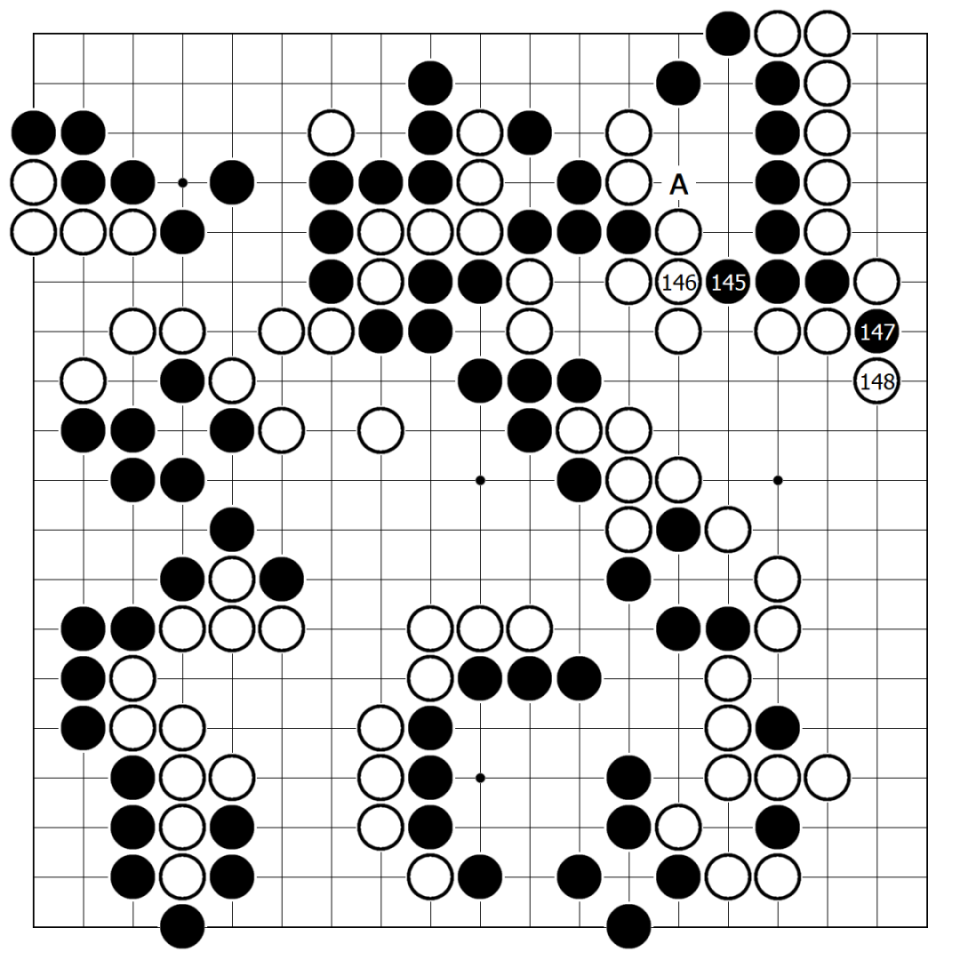 白棋如果护住A位弱点,那么黑棋相当于先手消除了白棋实战变化,继续按照实战收官即可。白棋如果选择抢先收官,黑棋兑现A位手段,吃掉两子足够补偿。