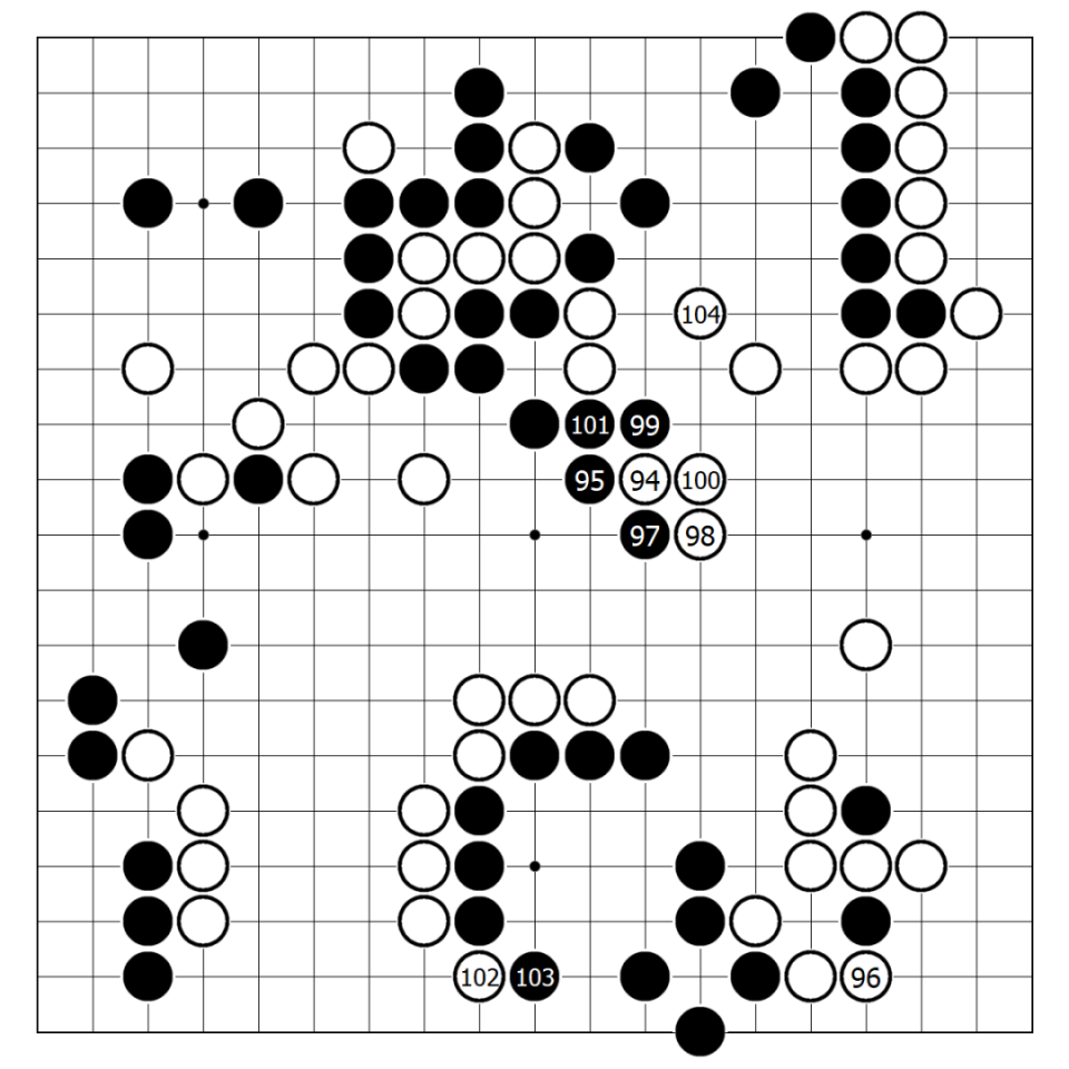 实战丁浩选择了求稳,白74拿捏黑棋相当愉快,左边一块形状明显比上图饱满不少。不过黑棋毕竟吃掉了6子,该有的实惠全部拿到,形势可以满意。