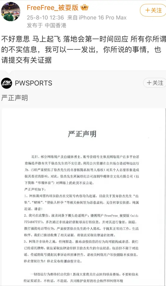 中国男篮在亚洲杯小组赛中取得三连胜,时隔十年再度以小组头名出线,然而这一体育成就的舆论关注度被前男篮球员徐杰的负面新闻完全覆盖。事件起源于徐杰担任男篮赛事解说期间,一名女性通过公开渠道对其提出涉及个人作风与违法行为的指控,相关话题迅速攀升至社交媒体热搜榜首。面对舆论发酵,徐杰所属经纪公司于次日凌晨发布正式声明,称所有指控均属恶意捏造,强调将通过民事诉讼及刑事控告追究造谣者法律责任。指控方则立即回应称其言论均有实证支持,并反要求徐杰方就其"造谣"指控提供相应证据。