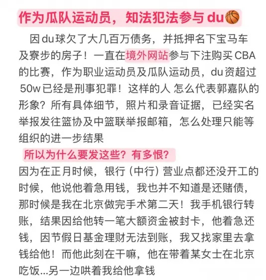 值得注意的是,针对徐杰的类似争议并非首次出现。公开记录显示,自2023年8月起,已有数位女性网民指控其存在情感纠纷问题,包括同时维系多段亲密关系、不当处理婚恋承诺等行为。虽然这些早期指控未获当事人正式回应且逐渐平息,但2025年5月又有网民通过发布合影配文暗示其行为失范。本次事件因新增"赌球"这一涉嫌违法行为的指控而引发更强烈的舆论震荡,其传播强度甚至超越了中国男篮的赛事热点。目前双方各执一词,事件真实性尚待司法程序或进一步证据披露予以厘清。